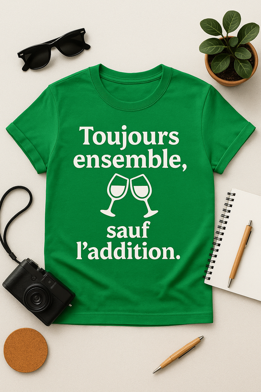 Célébrez l’amitié… mais chacun paie sa part ! Notre T-shirt « Toujours ensemble, sauf l’addition » est la touche d’humour parfaite pour ceux qui partagent tout, sauf la facture. Avec son coton ultra doux et sa coupe moderne, il fait autant rire qu’il est agréable à porter. À porter fièrement en soirée, entre collègues ou à chaque fois que l’addition arrive !