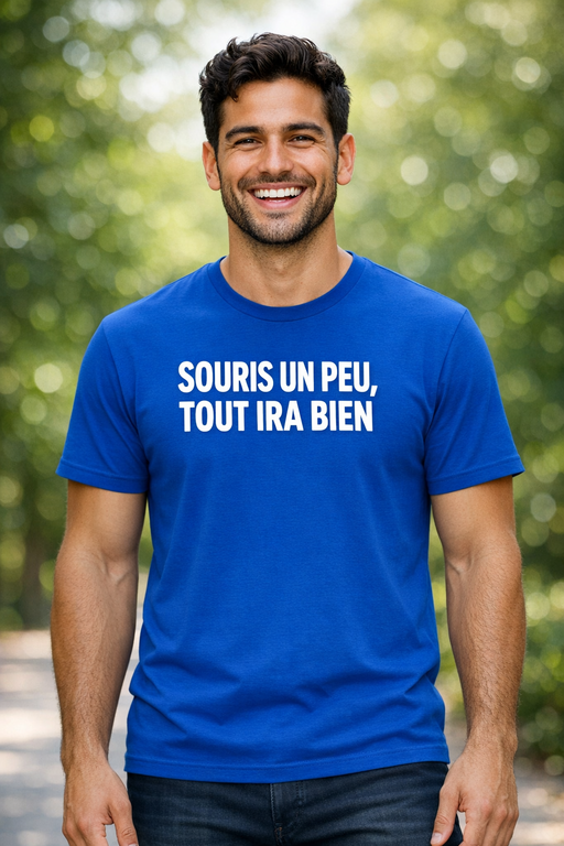 Avec son bleu intense et son message SOURIS UN PEU, TOUT IRA BIEN, ce t-shirt apporte une dose de positivité sans effort. Parfait quand la journée déraille : il parle pour vous, avec humour et bonne humeur.