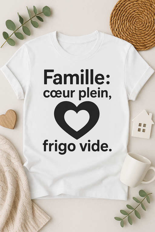 Affichez fièrement vos priorités avec notre t-shirt « Famille : cœur plein, frigo vide ». Parfait pour les papas, mamans, enfants et tous ceux qui savent que l’amour familial ne remplit pas le frigo… mais le cœur, oui ! Confortable, doux et 100 % coton, ce t-shirt est votre allié pour des repas partagés… ou des fonds de placard vides !