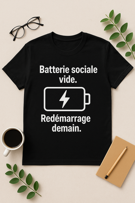 Besoin d’un t-shirt qui parle pour vous quand votre patience sociale est en mode économie d’énergie ? Ce t-shirt « Batterie sociale vide. Redémarrage demain. » est votre nouveau compagnon de survie émotionnelle. Parfait pour les introvertis, les travailleurs du lundi au vendredi, ou tous ceux qui considèrent Netflix comme une sortie. 100% coton, confort maximum, et surtout zéro obligation de small talk.