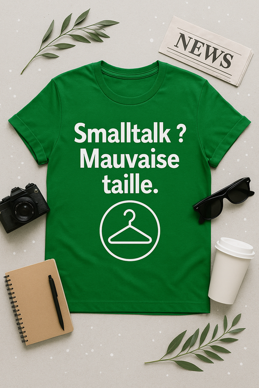 Marre des bavardages superficiels sur le temps qu’il fait ? Ce t-shirt est fait pour vous ! Avec son slogan percutant ‘Smalltalk ? Mauvaise taille.’, il affiche clairement votre préférence pour les conversations profondes (ou le silence). Conçu en coton ultra confortable, il combine style, sarcasme et authenticité. Parfait pour les soirées, les pauses café, ou toute situation où un petit pavé dans la mare est nécessaire. Provocateur ? Oui, mais avec humour !