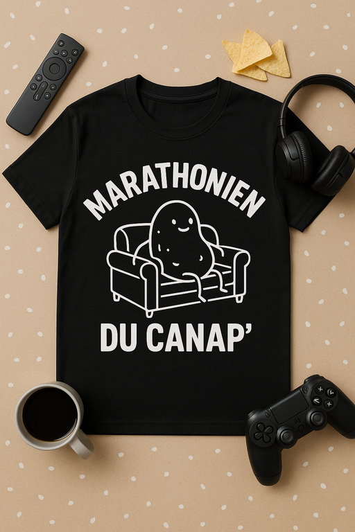 Qui a dit qu’il fallait courir pour être un marathonien ? Avec notre t-shirt « Marathonien du canap’ », affichez fièrement votre sport favori : le binge-watching, le grignotage et la farniente ! Ultra doux, coupe parfaite et humour assumé, ce t-shirt est l’équipement officiel des pros de la télécommande. Idéal pour les dimanches chill, les soirées Netflix ou les siestes après-manger… Enfilez-le et devenez le roi ou la reine du salon !