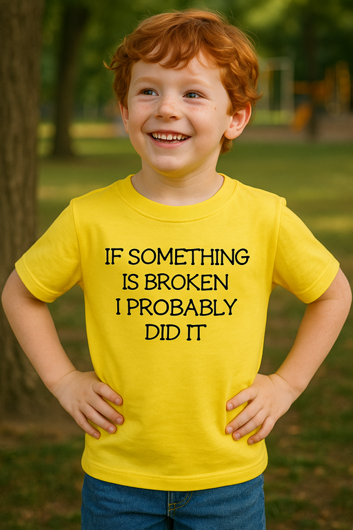 😂 T-shirt jaune + aveu honnête = fous rires garantis : IF SOMETHING IS BROKEN I PROBABLY DID IT ! Pour tous les petits malins qui “testent” les jouets, les boutons et… la patience des parents.