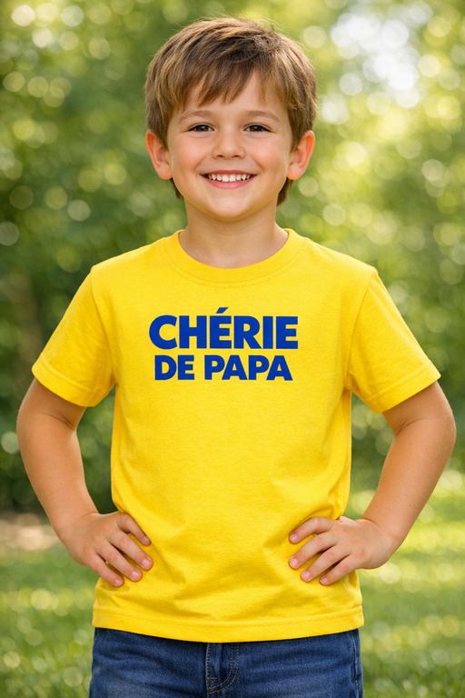 Jaune soleil + texte bleu bien visible : la tenue officielle de la CHÉRIE DE PAPA. Idéal pour faire sourire, attirer les compliments et immortaliser les plus beaux moments en famille.