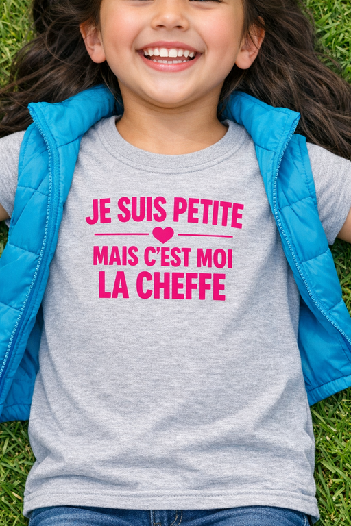 Un message qui annonce la couleur avec humour : « JE SUIS PETITE MAIS C’EST MOI LA CHEFFE ». Idéal pour les petites leaders qui savent déjà ce qu’elles veulent et qui le portent fièrement.