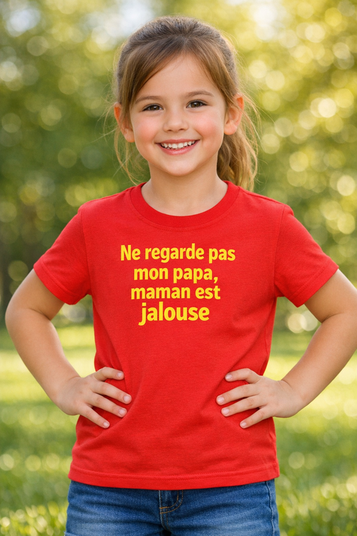 Avec son message « Ne regarde pas mon papa, maman est jalouse », ce t-shirt fait sourire tout le monde et donne à votre enfant un style COOL et plein de caractère.